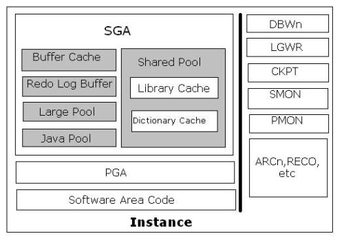 - SGA (System Global Area): 서버 프로세스와 백그라운드 프로세스가 공통으로 액세스하는 데이터, 제어구조를 캐싱하는 메모리 공간