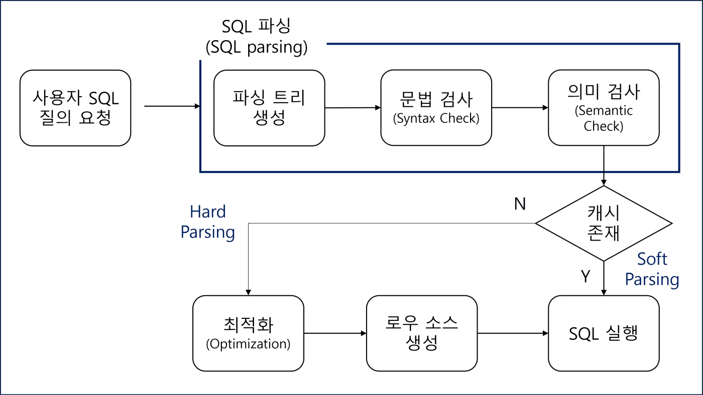 - SQL 캐싱 여부에 따라 soft, hard parsing 사용